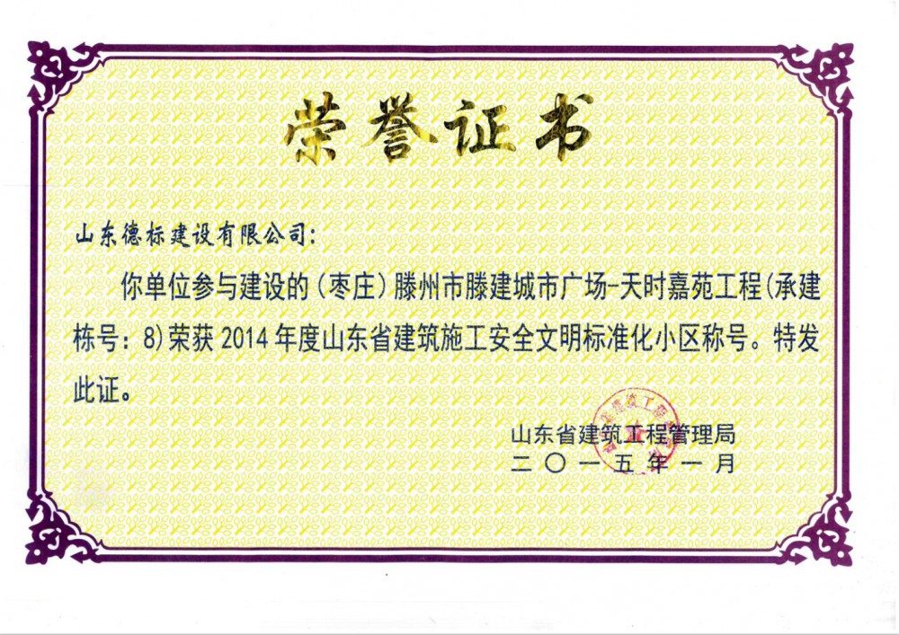 2014年度山東省安全文明標(biāo)準(zhǔn)化小區(qū)-天時(shí)嘉苑工程