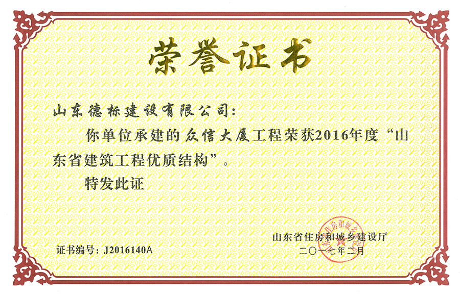 2016年度山東省建筑工程優(yōu)質(zhì)結(jié)構(gòu)-眾信大廈工程